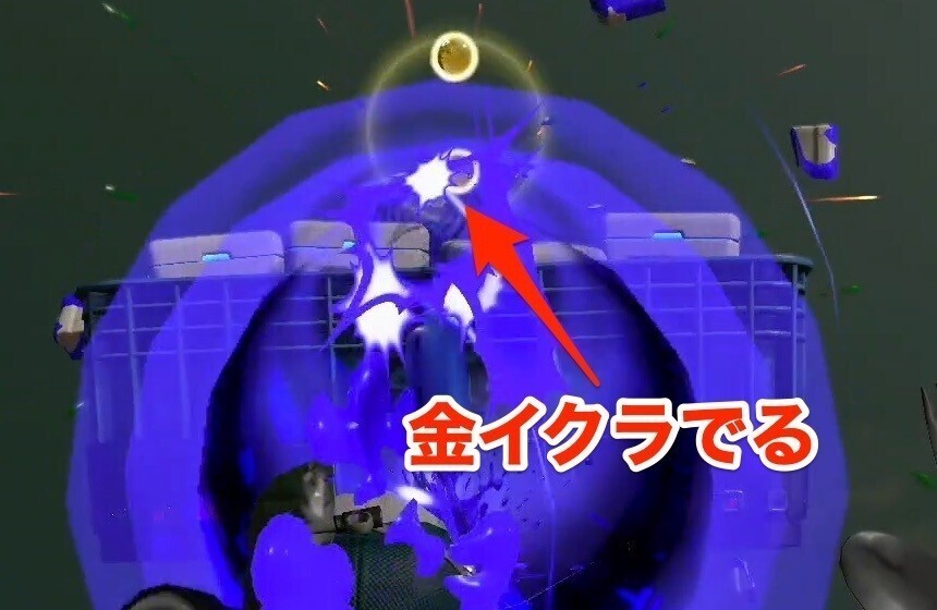 母艦の上のシャケコプターの吹き出し口を狙うイメージです。うまく当たると連続して金イクラを出すことができます。母艦の下の管の部分を狙っても金イクラは出ませんので注意しましょう。